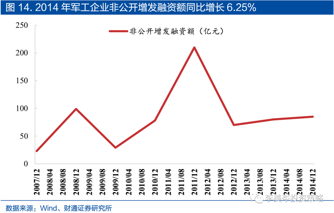 阶段3:从2012年12月到2014年10月,相对沪深300超额收益为149%。政府放宽军工集团上市限制,军工集团重组进程加快,“民养军”有助于打破军工行业垄断。2013年初,主管部门对核心军工资产上市的态度改善,哈飞股份注入资产获批。同时,自2007年,中航光电、中国重工等军工企业陆续上市,上市公司定向增发比重加大,资产证券化率提升,“民养军”趋势日益显著。对行业看好的强烈预期带来军工板块在创业板行情的一波大幅上涨。