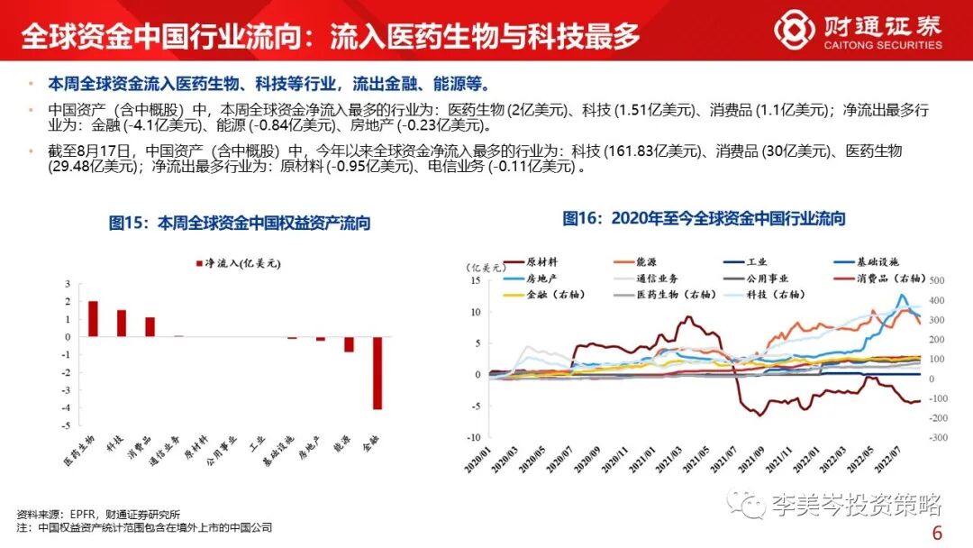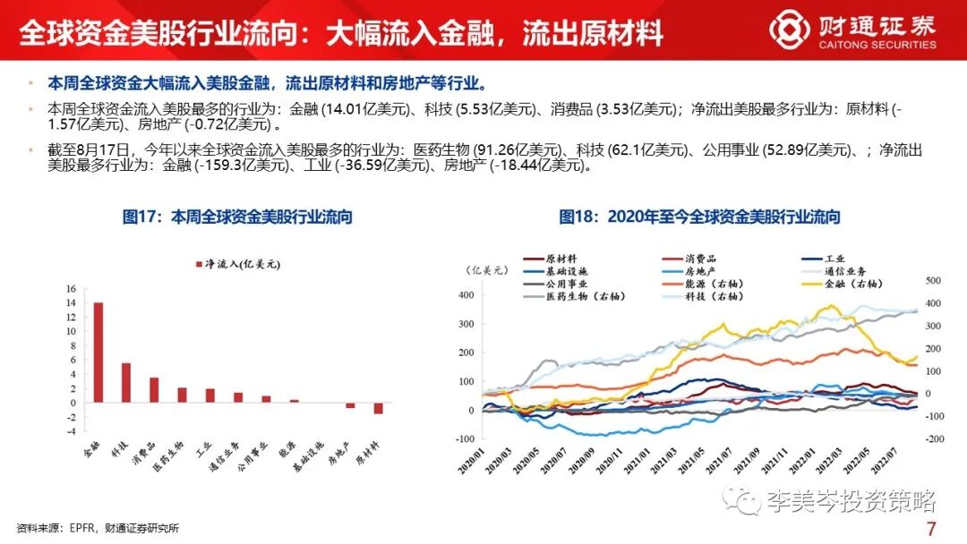1)大类角度,全球资金本周流入股票、债券市场,流出货币市场;从净流入额来看,股票>债券>货币。