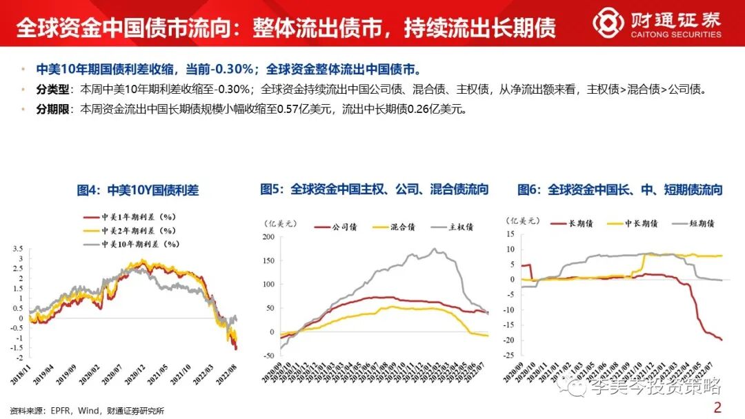 2)债市流向,本周中美10年期利差收缩至-0.30%;全球资金持续流出中国债市,大幅流出美国主权债。