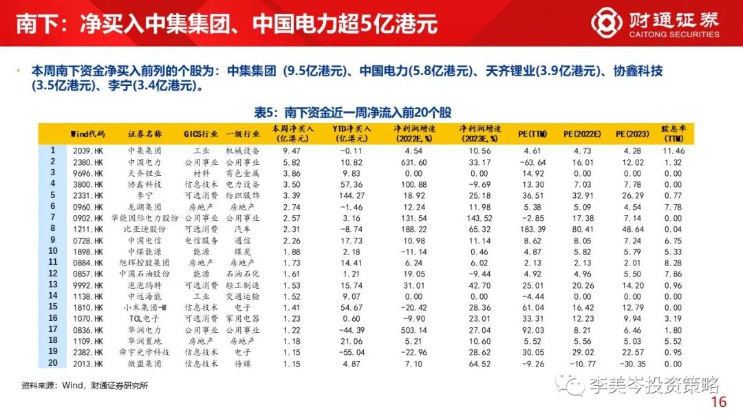 3)个股角度而言,本周南下资金大幅买入:中集集团 (9.5亿港元)、中国电力(5.8亿港元)、天齐锂业(3.9亿港元)等个股。