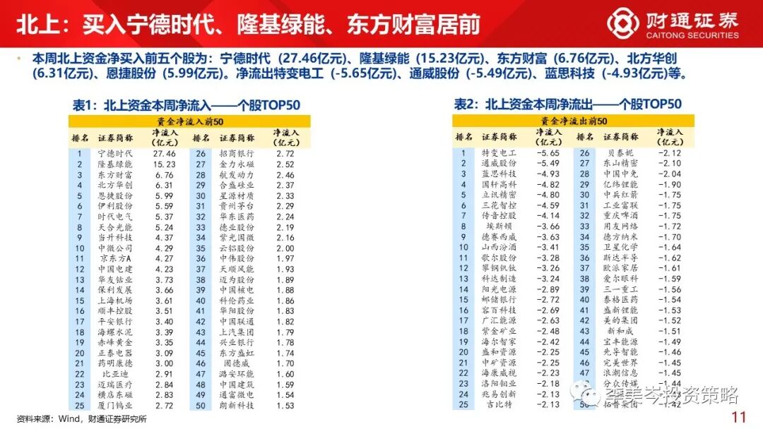 3)个股角度而言,宁德时代 (27.46亿元)、隆基绿能 (15.23亿元)、东方财富(6.76亿元)、北方华创 (6.31亿元)、恩捷股份 (5.99亿元)居前;净流出特变电工 (-5.65亿元)、通威股份 (-5.49亿元)、蓝思科技(-4.93亿元)居前。