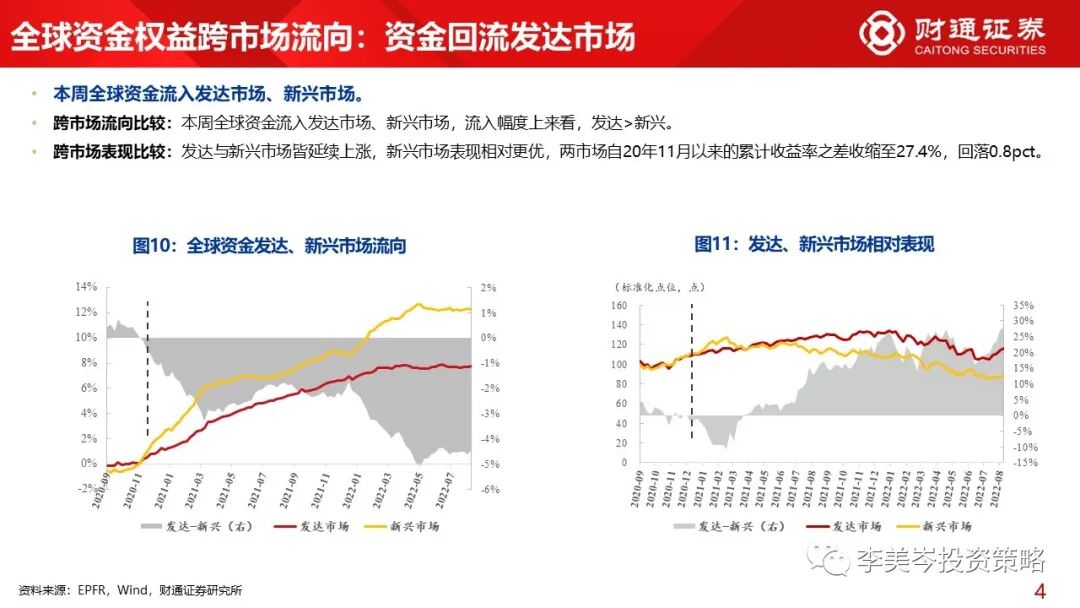 3)跨市场&风格角度,本周全球资金流入发达市场、新兴市场,成长&小盘风格受资金青睐。