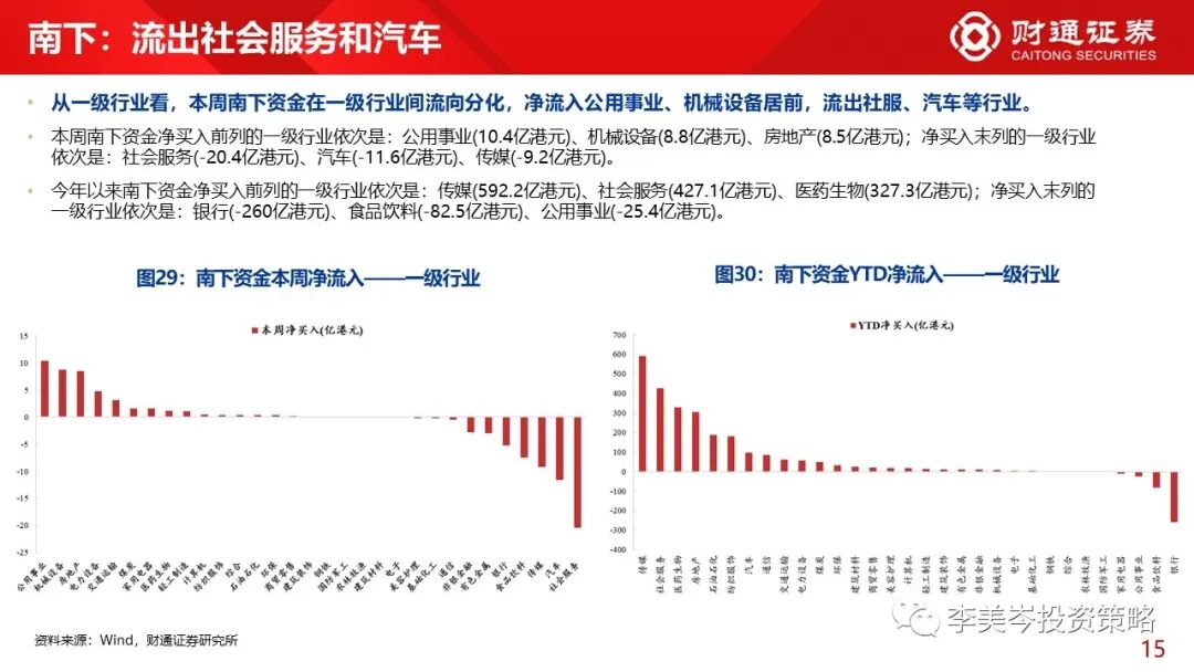 2)一级行业而言,公用事业(10.4亿港元)、机械设备(8.8亿港元)、房地产(8.5亿港元);净买入末列的一级行业依次是:社会服务(-20.4亿港元)、汽车(-11.6亿港元)、传媒(-9.2亿港元)。今年以来南下资金净买入前列的一级行业依次是:传媒(592.2亿港元)、社会服务(427.1亿港元)、医药生物(327.3亿港元)。