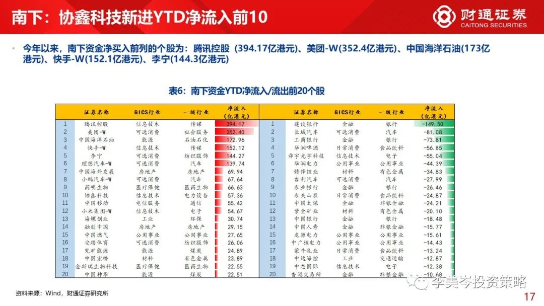 1)GICS行业而言,本周南下资金在GICS行业间流向分化;净流入工业(12.2亿港元)、公用事业(10.8亿港元)、房地产(8.9亿港元);净买入末列的GICS行业依次是:可选消费(-29亿港元)、金融(-7.8亿港元)、日常消费(-7.5亿港元)。