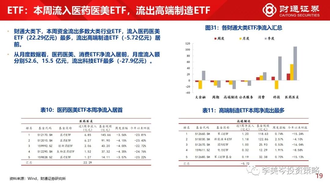 2)行业视角上,本周流出多数大类行业ETF,流入医药医美ETF(22.29亿元)最多,流出高端制造ETF(-5.72亿元)居前。从月度数据看,医药医美、消费ETF净流入居前,月度流入额分别52.6、15.5 亿元,流出科技ETF最多(-27.9亿元)。