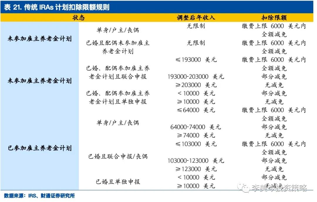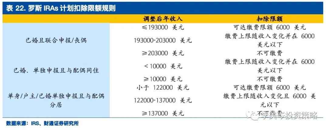 账户开立后,投资者可以通过任意银行卡、支票等多种形式进行缴费,影响到缴费环节的个人因素包括年龄、收入、婚配、是否参与雇主养老金计划等。年龄方面,在2020年以前,传统IRAs计划有“申请年年末参与者年龄不超过70.5岁”,但在2020年取消了这一年龄限制,而罗斯IRAs计划则始终没有对申请者的年龄做限制。收入及婚配方面,传统IRAs计划在缴费环节给予投资者税前扣除优惠,已婚的减免门槛高于未婚,高收入的减免门槛高于低收入甚至不减免。而罗斯IRAs计划在缴费环节不能享受税前扣除,但缴费上限也会根据参与者的收入水平有所变化。