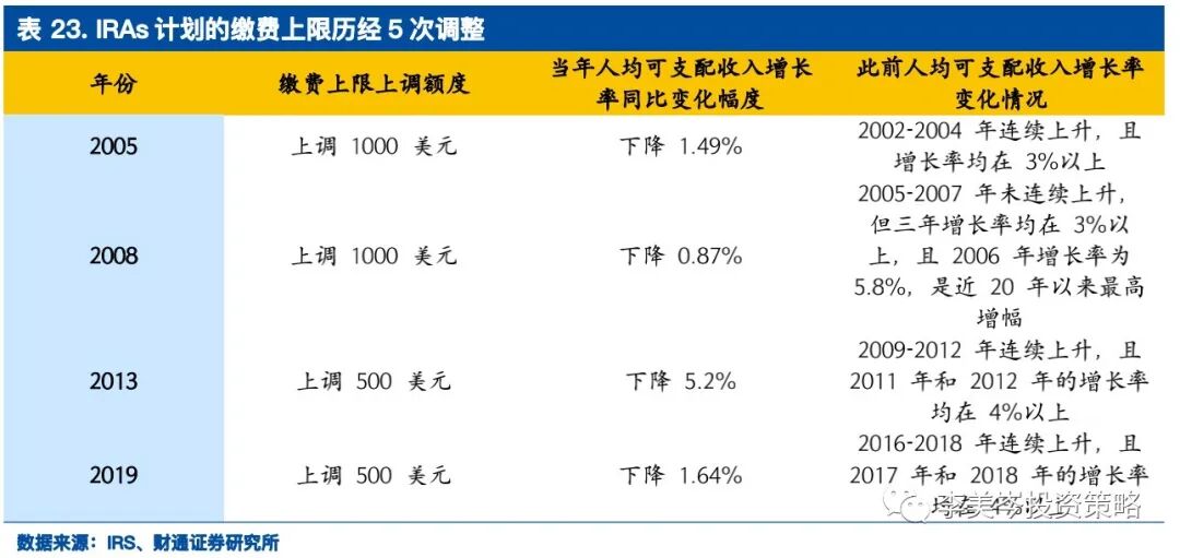 IRAs计划的缴费上限会根据收入、通胀等情况不定期调整。根据《经济增长和税收减免调整法案》,自2001年起根据物价水平、薪酬水平不定期调整IRAs计划缴费上限。近20年以来,IRAs计划的缴费上限历经5次调整,从2001年的每年2000美元调整到2019年的每年6000美元。2020年传统IRAs计划和罗斯IRAs计划的缴费上限保持一致,二者均为6000美元。收入水平是调整IRAs计划缴费上限的重要依据。在缴费上限上调的前一段时间,往往会出现人均可支配收入增长率连续上升的情况,四次上调中有上次出现了这一现象。而在缴费上限上调的当年,人均可支配收入的增幅都会较前一年有所下降,甚至出现负增长,缴费上限的提高或将促使多数参与者相应的提高了缴费金额,故导致可支配收入减少。