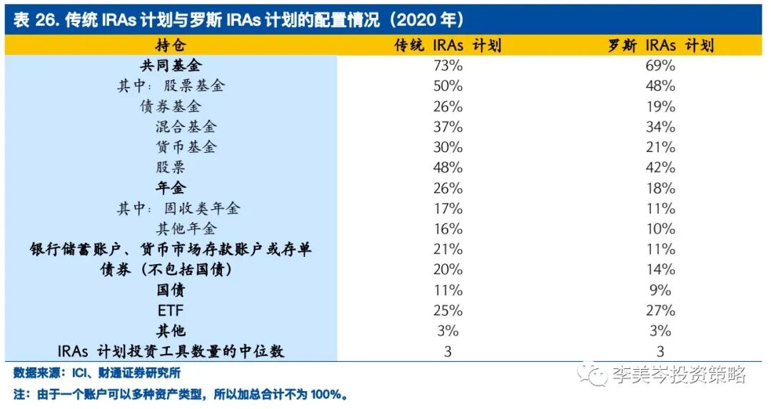从资产配置的分布情况来看,共同基金占据了IRAs计划的“半壁江山”。在IRAs计划推行初期,有七到八成参与者将IRA账户交由银行管理。但大多数银行给IRA的投资人提供的投资方式有限,通常是提供一个储蓄账户,包括存款证(简称CD,类似定期存款)或者货币市场账户。随着美国资本市场的发展与配套政策的完善,共同基金和券商在资产管理业务上的专业化优势凸显:截至2020年,共同基金管理的IRAs计划资产占比达到45%,银行为6%,保险公司为4%,而其他机构(主要以经纪商为主)占比为47%,共同基金及券商为代表的非银机构已经成为IRAs管理的主力。
