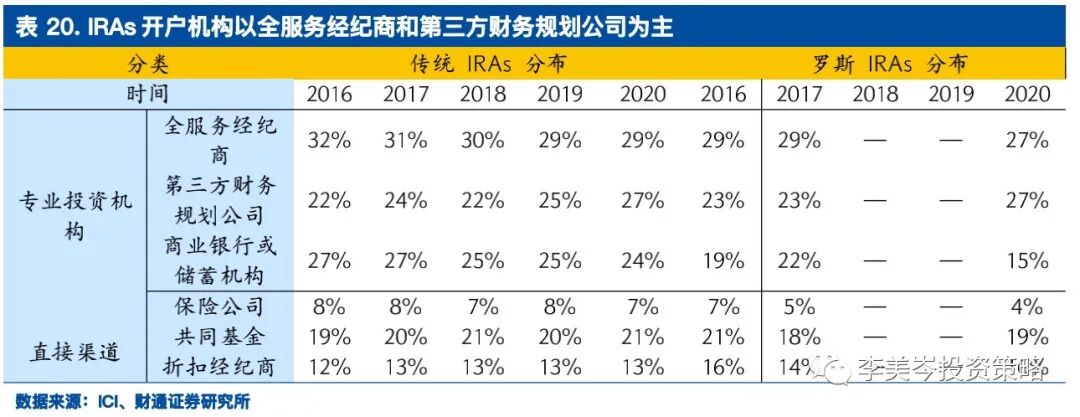 传统与罗斯IRAs计划的参与者更偏向于通过专业投顾机构来开设账户,其中全服务经纪商和第三方财务规划公司最受欢迎。根据ICI的调查数据,截止2020年上半年,在这些拥有传统IRAs计划的家庭中,有七到八成左右选择专业投顾来持有账户,其中开设在全服务经纪商和第三方财务规划的账户数量占比超过50%;选择直接渠道来开设账户的家庭则对共同基金较为偏好,占比约21%。罗斯IRAs计划的账户分布情况与传统型较为相似,全服经纪商与第三方财务规划公司最受欢迎,此外在最近5年的变化趋势上体现出更为明显的银行与保险机构的占比下降。