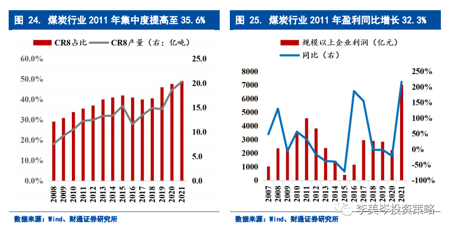 煤炭需求滞后于经济发展仍有小幅提升,加之去产能政策持续发力,煤炭行业集中度提高,供需错配的情况下煤炭走出独立行情,取得超额收益。截至2011年,煤炭行业产煤量前8的公司产煤量达12.27%,同比增长17%,规模以上企业盈利持续改善,同比增长32.3%。