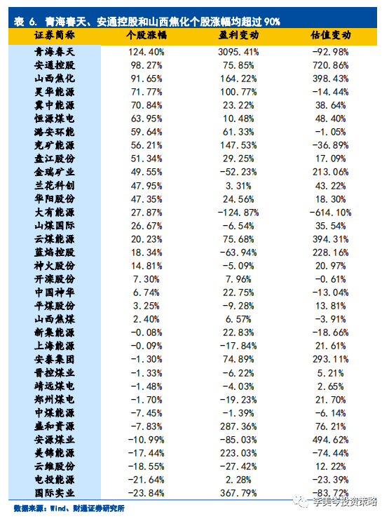 本阶段位于盈利改善前三位的个股分别是国际实业、美锦能源和安泰集团,盈利改善分别为1366.41%、614.37%、606.82%。本轮行情中,受煤价上涨影响,上市煤企仅5家亏损。兖州煤矿、山西焦煤等大型煤企在本轮行情中也获得了较大的成长性。
