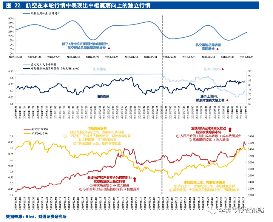 2009年下半年开始,随着“四万亿”等强刺激政策完成经济复苏的使命后,财政与货币政策逐步回归常态,央行通过连续抬高正回购利率、上调存款准备金率等方式回收流动性。同时“新国四条”开始严厉调控地产。沪深300从2009年年底的3400点一路下至2900点,而航空受益于自身的高景气(民航总周转同比+30%,两次大规模横向并购)出现逆势上涨,超额收益超过46%。此后随着出行需求下滑,航空也随着市场出现调整。10年6月,人民币升值再度带来正向驱动,在2010年下半年的震荡上涨行情中跑赢市场,超额收益约为28%。