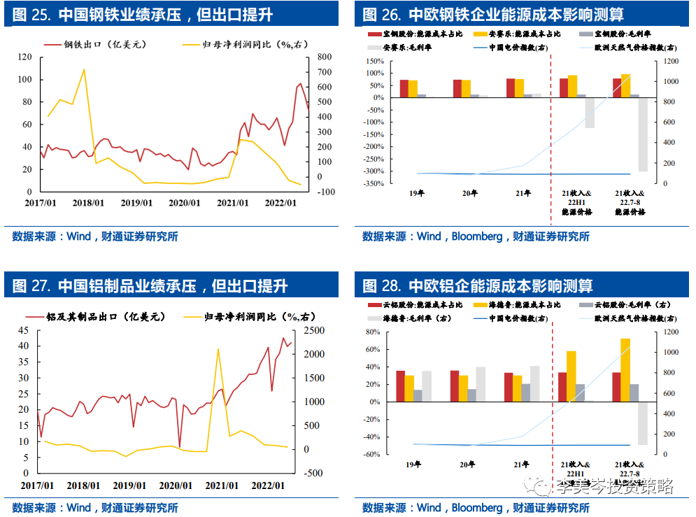 2)冶炼链:钢铁金属等冶炼厂在高能耗成本负荷下减产停产,欧洲供给短缺和高成本下中国出口受益。欧洲的钢材产量主要来自高能耗的电弧炉或小型钢厂,欧洲钢铁行业的能源成本占比达10%,能耗强度2.1,均排名前列,其他采矿业能源成本占比也达5%以上。电价的快速上涨限制废铁冶炼成新钢材,许多冶炼厂因高昂成本关闭,其他高能耗金属类似。可关注出口提升的钢铝等。
