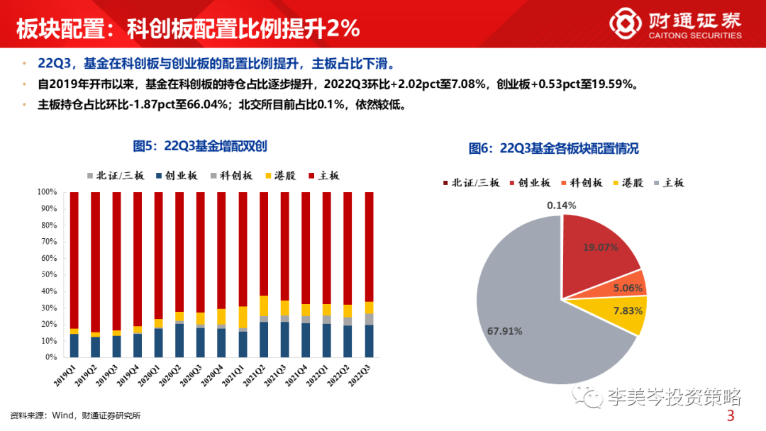2)板块配置:科创板与创业板配置比例提升,主板配置比例-1.87pct。科创板占比自2019年开市以来逐步提升,当前7.08%。港股持仓占比小幅-0.6pct至7.19%;北交所目前占比0.1%,仍处于较低水平。