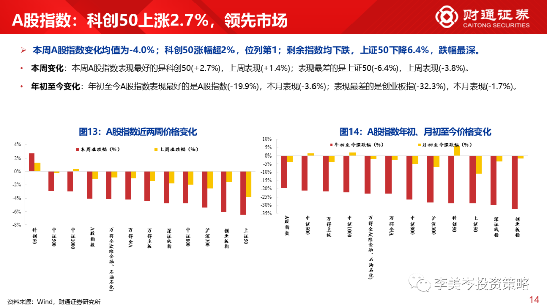 A股指数:表现最好的是科创50(+2.7%),上周表现(+1.4%);表现最差的是上证50(-6.4%),上周表现(-3.8%)。