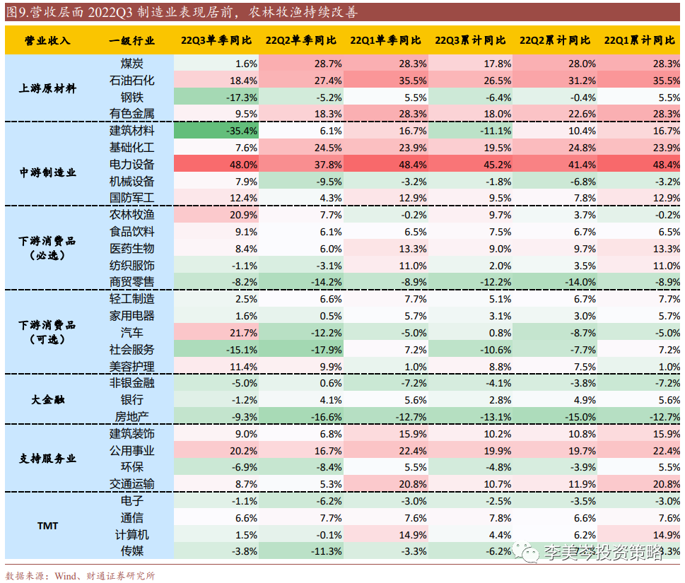 上游原材料和中游制造业行业呈现不同程度下滑。建筑材料、煤炭、基础化工、钢铁、石油石化和有色金属22Q3的营收单季同比分别是-35.4%、1.6%、7.6%、-17.3%、18.4%和9.5%,较22Q2分别下降42/27/17/12/9/9个百分点。