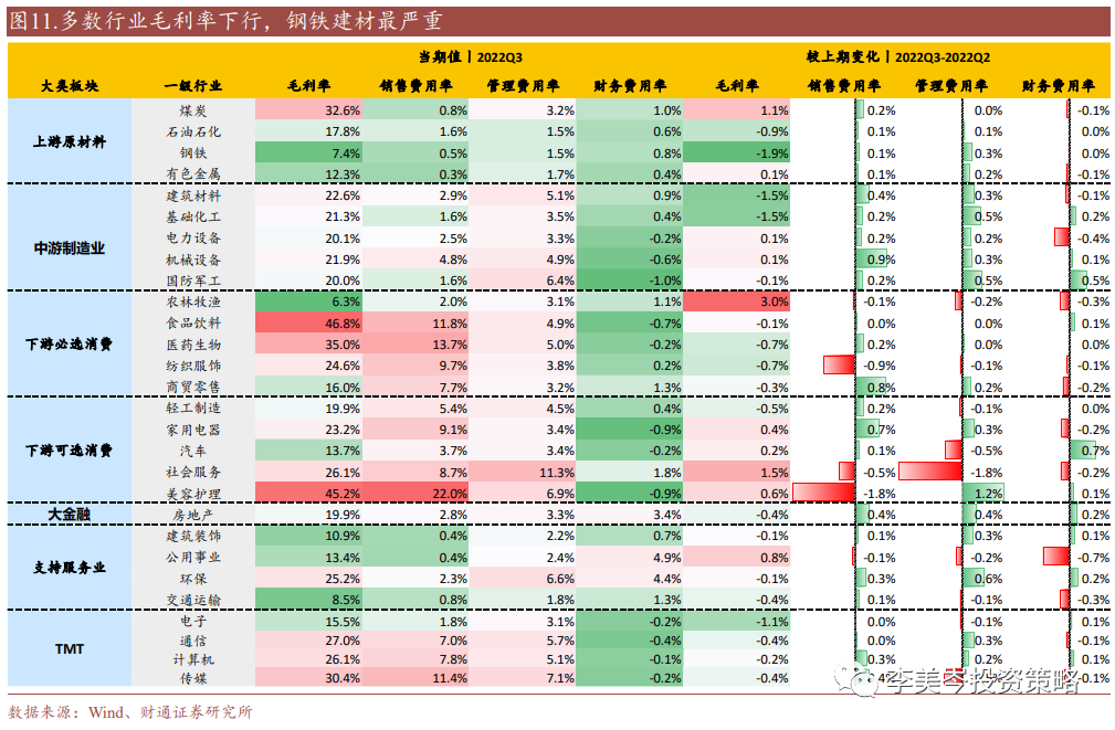 22Q3多数行业毛利率较上期下滑,上游原材料钢铁下行明显。行业方面,农林牧渔(+3.0%)、社会服务(+1.5%)、煤炭(+1.1%)、环保(+0.8%)毛利率出现提升。上游原材料板块受降价影响受损最严重,钢铁、基础化工和建筑材料毛利率降幅最多,分别为-1.9%/-1.5%/-1.5%。