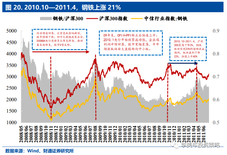 2010.10-2011.4,沪深300下降2.33%,钢铁行业实现23.37%的超额收益,其中EPS下降21.6%,PE增长40.34%。