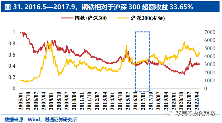 回顾2005年以来,钢铁板块相对于沪深300的表现,我们选取持续时间半年以上,回撤相对较小,共有五段超额收益行情。