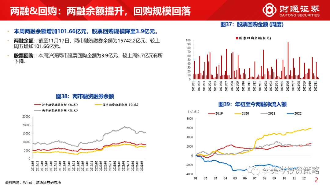 两融&回购:截至11月17日,两市融资融券余额为15742.2亿元,较上周五增加101.66亿元。今年以来两融净流出2547亿元。本周回购规模降至3.9亿元。