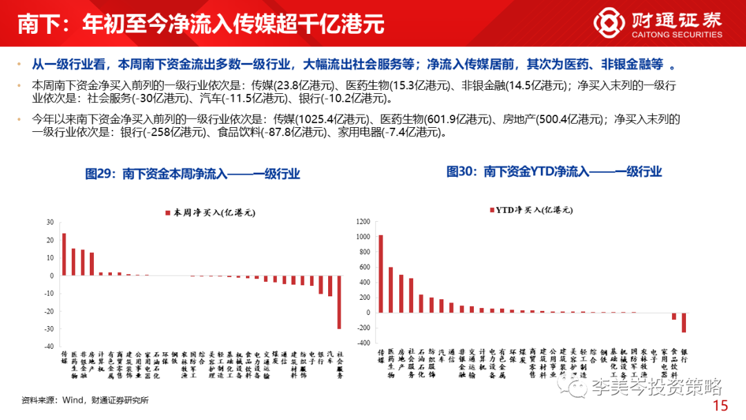 2)一级行业而言,本周南下资金净买入前列的一级行业依次是:传媒(23.8亿港元)、医药生物(15.3亿港元)、非银 金融(14.5亿港元);净买入末列的一级行业依次是:社会服务(-30亿港元)、汽车(-11.5亿港元)、银行(-10.2亿港元)。