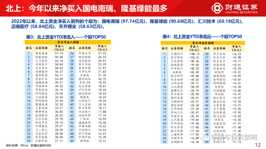 3)个股角度而言,本周北上资金净买入前五个股为:贵州茅台 (29.89亿元)、美的集团 (24.52亿元)、招商银行 (18.13亿元)、 中国平安 (17.96亿元)、紫金矿业 (14.62亿元)。净流出隆基绿能 (-4.51亿元)、国电南瑞 (-4.07亿元)、闻泰科技 (-3.88亿元)等。