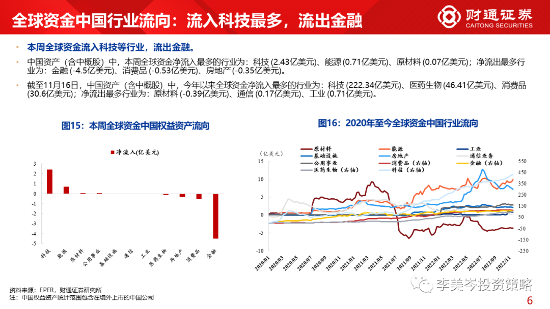 4)行业角度,11月10日-11月16日,全球资金流入美股医药生物 (7.92亿美元)、金融 (7.82亿美元)等行业居前;中国权益资产中,流入科技 (2.43亿美元)最多。