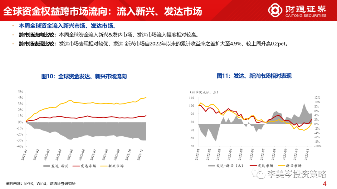 3)跨市场&风格角度,本周全球资金流入新兴&发达市场,发达市场流入幅度相对较高;本周平衡&小盘风格更受青睐。