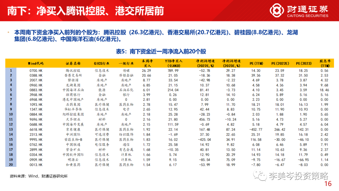 3)个股角度而言,本周南下资金净买入前列的个股为:腾讯控 股 (26.3亿港元)、香港交易所(20.7亿港元)、碧桂园(8.8亿港元)、龙湖集团(6.8亿港元)、中国海洋石油(6亿港元)。