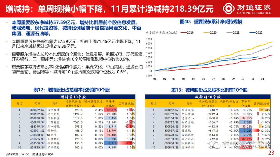 重要股东增减持:净减持额较前周减少, 本周重要股东净减持57.6亿元, 11月以来净减持累计规模218.4亿元。增持比例居前个股信息发展、乾照光电、现代投资等。