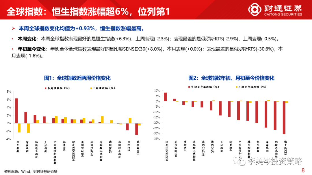 全球指数:表现最好的是恒生指数(+6.3%),上周表现(-2.3%);表现最差的是俄罗斯RTS(-2.9%),上周表现(-0.5%)。
