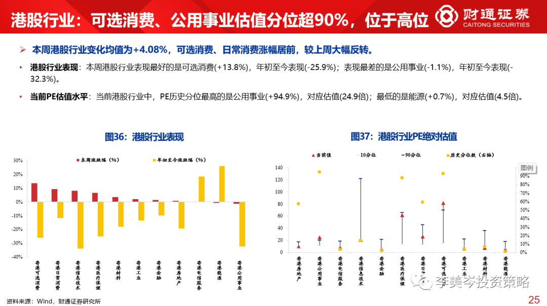 港股行业:PE历史分位最高的是公用事业(+94.9%),对应估值(24.9倍);最低的是能源(+0.7%),对应估值(4.5倍)。
