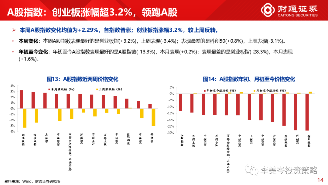 A股指数:表现最好的是创业板指(+3.2%),上周表现(-3.4%);表现最差的是科创50(+0.8%),上周表现(-3.1%)。
