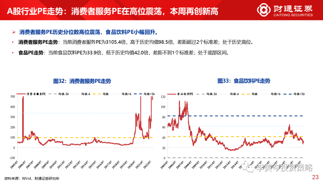 A股行业:PE历史分位最高的是消费者服务(+99.9%),对应估值(3105.4倍);最低的是煤炭(+0.2%),对应估值(6.8倍)。