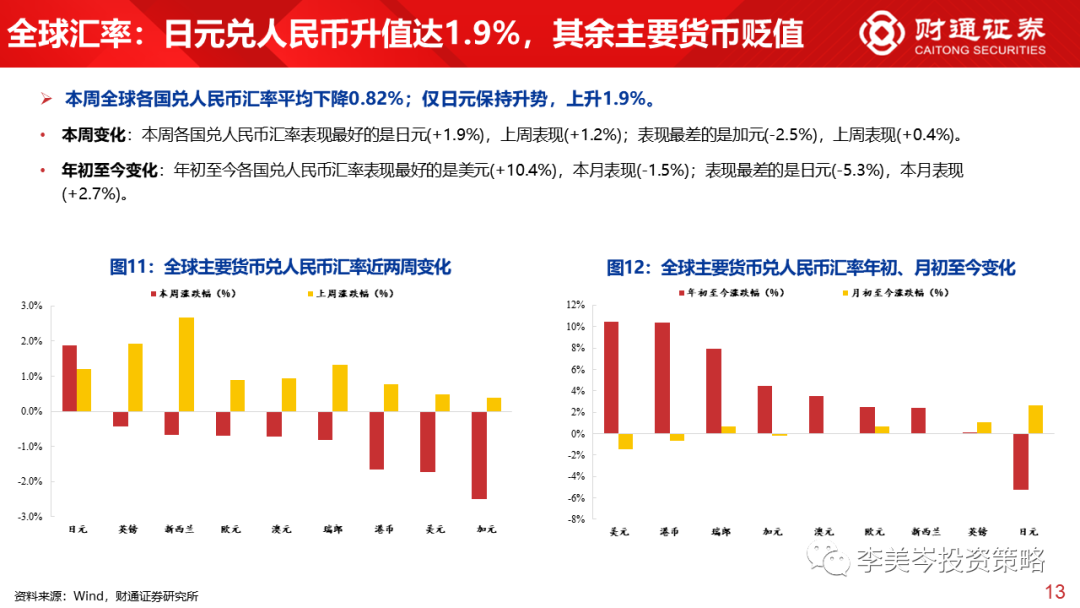 各国货币兑人民币汇率:表现最好的是日元(+1.9%),上周表现(+1.2%);表现最差的是加元(-2.5%),上周表现(+0.4%)。