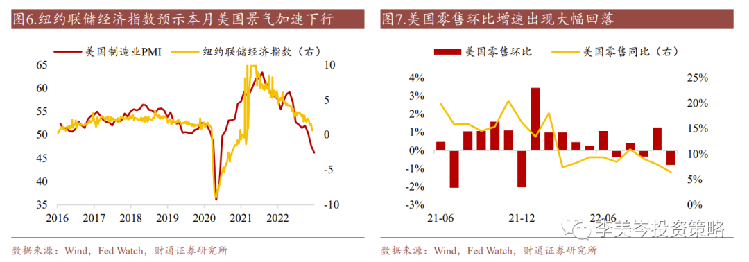 2) 周四和周五美国经济高频数据不及预期,引发美股下跌。15号美国纽约联储公布11月制造业指数为-11.2(预期-1,、前值4.5),整体经济指数也进一步下行,预示着美国经济正在较快走弱。16号公布的美国11月零售环比销售额更是大幅下行0.6%,是2021年12月以来新低。面对从制造到消费的衰退信号,下半周美股下跌近5%。