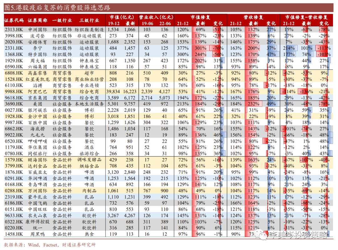 2) 港股方面,关注方向1(黄):市值还未修复的困境行业,如零售、博彩、食品。关注方向2(标灰):市值修复<营收修复(即PS较19年下降),如纺织制造、大众食品。关注方向3(蓝):今年用“营收修复”大幅消化“市值修复”,表现为PS较2021年下降,如运动服饰、部分食品饮料。其他行业可以权衡业绩增长和消化估值之间的平衡,如餐饮。