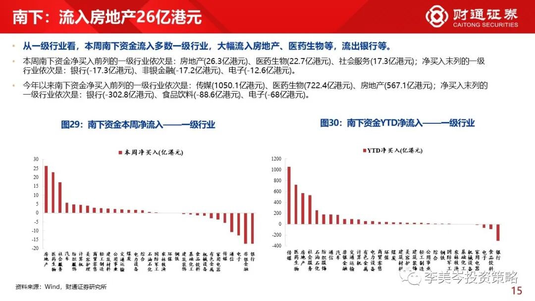 2)一级行业而言,本周南下资金净买入前列的一级行业依次是:房地产(26.3亿港元)、医药生物(22.7亿港元)、社会服务(17.3亿港元);净买入末列的一级行业依次是:银行(-17.3亿港元)、非银金融(-17.2亿港元)、电子(-12.6亿港元)。