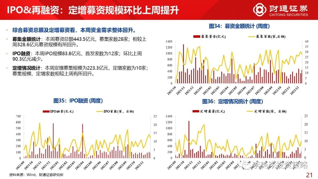 国内市场资金需求:本周募资总额443.5亿元,较上周有所回升,其中IPO规模83.8亿元,首发家数12家;定增募集规模223.3亿元,较上周有所回升。