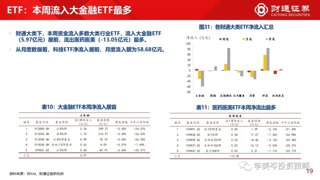 2)行业视角上,财通大类下,本周资金流入多数大类行业ETF,流入大金融ETF(5.97亿元)居前,流出医药医美(-13.05亿元)最多。从月度数据看,科技ETF净流入居前,月度流入额为58.68亿元。