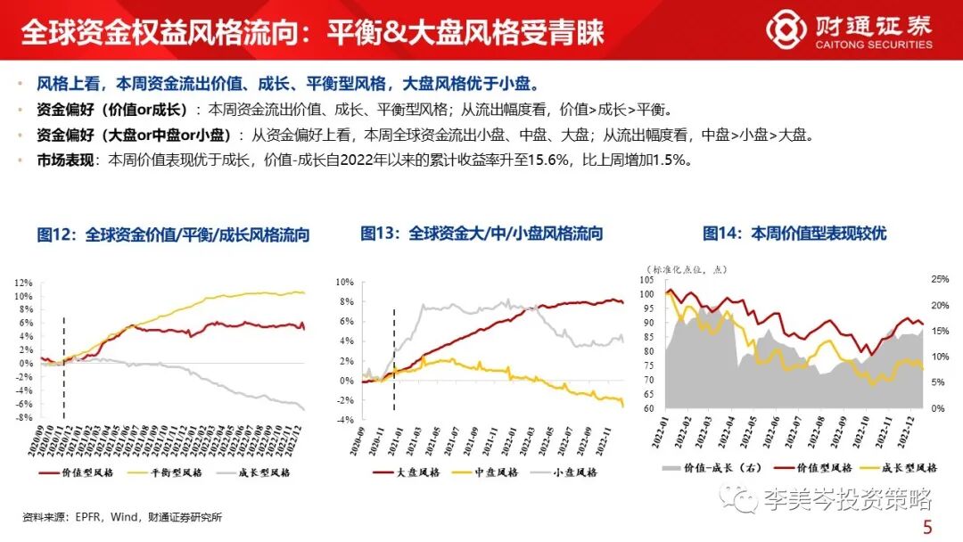 3)跨市场&风格角度,本周全球资金流入新兴市场,流出发达市场;本周平衡&大盘风格更受青睐。