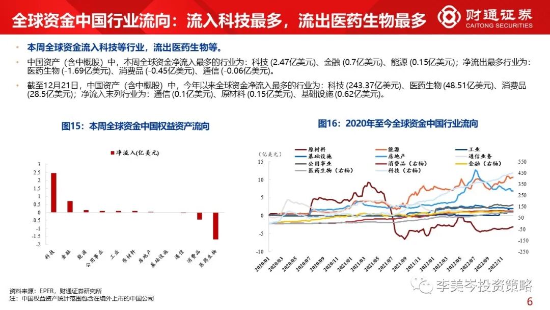 4)行业角度, 12月15日-12月21日,全球资金流入美股医药生物(3.58亿美元)、消费品(2.92亿美元)等行业居前;中国权益资产中,流入科技(2.47亿美元)最多。