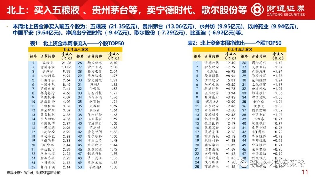 3)个股角度而言,本周北上资金净买入前五个股为:五粮液 (21.35亿元)、贵州茅台 (13.06亿元)、水井坊 (9.95亿元)、以岭药业 (9.94亿元)、中国平安 (9.64亿元)。净流出宁德时代 (-9.4亿元)、歌尔股份 (-7.29亿元)、比亚迪 (-6.92亿元)等。