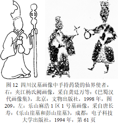 最左边(画面自身的右部、可相对地代表来自西方),出现了一个耐人寻味的史外情节:一羽人手持药囊(四川地区汉墓所见类似的持药囊仙人,见图11下、图12;彭山汉画像砖所见西王母身边手持药袋的蟾蜍,见图13)从荆轲身后从容向他走去,正在拦腰抱住荆轲的秦臣注意到羽人的到来,蓦然回望,表情甚奇(这一眼神乃将其人与羽人相联结)。检之汉墓画像,鲁南传统的“刺秦”图,素未见有羽人致神药的迷人情节,亦无载于传世文献,唯巴蜀有之。由此可知,“荆轲刺秦”故事于汉末巴蜀另有版本,出现了更多脍炙人口的演绎。同样值得注意的是,该墓中还出现了“完璧归赵”故事画像(图11上),亦同属崇扬英雄气节而“贬秦”之主题,尽管此处“秦人”为春秋“五霸”之一的秦昭襄王,而亦无妨乎用“贬”(说见下文)。