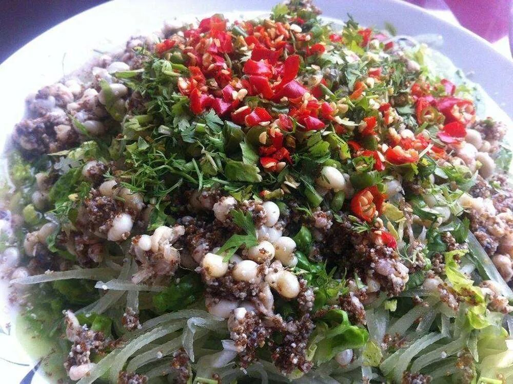 想吃糕点油炸,有炸苞谷粑粑、油香、洋芋条、韭菜盒子、荞饼、藕饼、乳扇;要是想吃点重口的,还有猪肉拌猪血、油炸蚂蚱、柠檬鸡、盐菜肉、牛干巴、铁锅鱼、炸猪皮、肉圆、烧椒茄子。