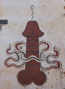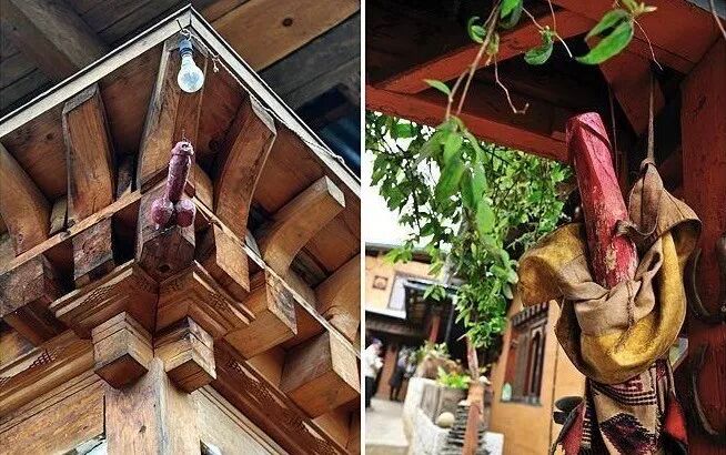 如开头所讲,在不丹的村落中,生殖器被镌刻在石头和土墙上,也被制作成颜色艳丽的装饰品,挂在房屋的两侧门边儿辟邪消灾。不丹人还在村口和泉眼边等他们觉得需要保护的地方竖起木雕阳具。