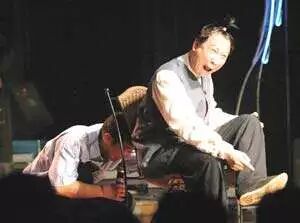 ▲相声演员大兵、赵卫国在表演双簧《金盆洗脚城》