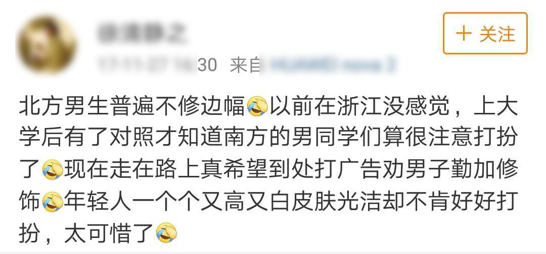 卫生间里他的发胶、发膜、发蜡、定型啫喱叠起来比我所有的化妆品还多,有时候推门进去看他敷着脚膜、坐沙发上拿着美容仪推脸,有种错觉我才是全世界最糙的那个汉子!”