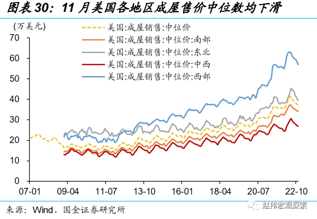 成屋售价继续下降,成屋库存同比增速扩大。美国11月成屋售价的中位数回落至37.07万美元,前值为37.8万美元,相比2022年6月高点(41万美元)已经回落10.4%。分地区看,美国四大区域成屋售价中位数共同回落,同比增速回落1至4个百分点,西部沿海地区同比增速最低,为2.0%,南部地区增速最高,为4.4%。绝对价格上,美国西部沿海地区成屋房价中位数最高,11月为57万美元;中西部地区成屋售价中位数最低,为27万美元。库存方面,成屋库存增速继续上升,11月为2.7%,前值-0.81%,反映成屋去库情况继续恶化。