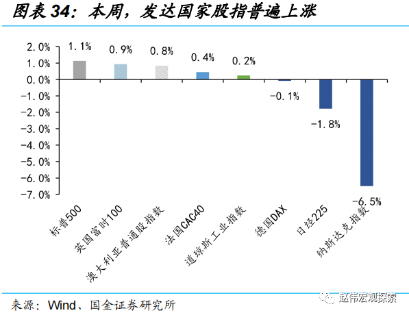 发达国家股指多数上涨,新兴市场股指普遍上涨。标普500、英国富时100、澳大利亚普通股指数、法国CAC40、道琼斯工业指数分别上涨1.1%、0.9%、0.8%、0.4%和0.2%,德国DAX、日经225和纳斯达克指数分别下跌0.1%、1.8%和6.5%。伊斯坦布尔证交所全国30指数、巴西IBOVESPA指数、泰国SET指数、南非富时综指分别上涨11.78%、2.70%、1.29%和0.30%,韩国综合指数、俄罗斯RTS分别下跌0.14%和2.94%。